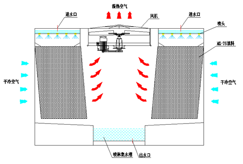 The hot water from the heat source flows into the upper diffuser of the cooling tower and is evenly sprayed on the packing surface through the diffuser under the action of gravity. At the same time, the air enters from the air inlet grilles on both sides of the cooling tower and sweeps across the packing and forms a cross flow with the spray water. A small part of the water is evaporated to take away heat and reduce the water temperature. The hot and wet air is discharged to the surrounding atmosphere by the fan at the top, and the cooled water falls to the collecting pan and returns to the heat source.